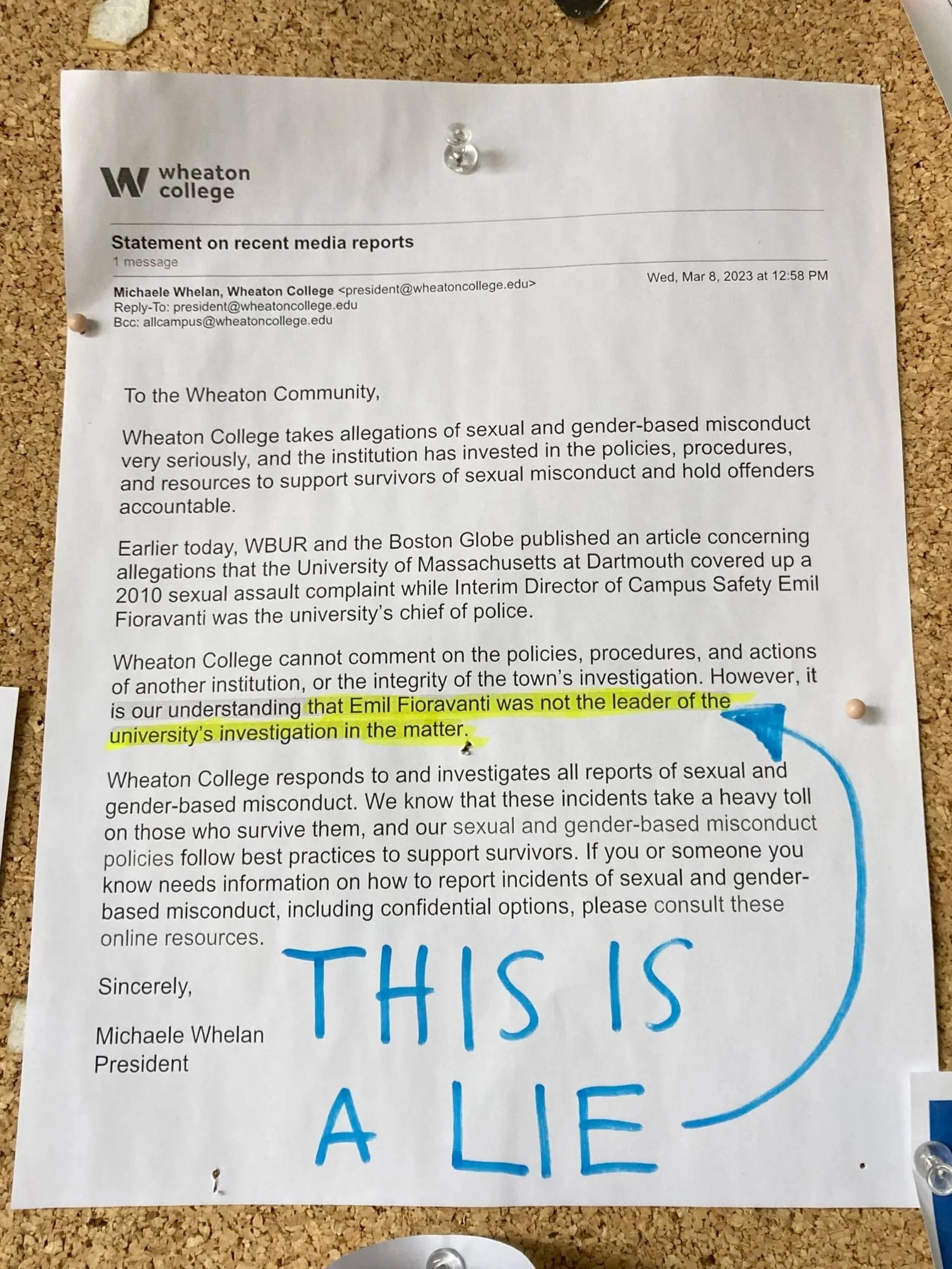 Adding another layer of complexity to the issue of campus safety at Wheaton is Emil Fioravanti, who is the interim chief. Director Fioravanti was recently mentioned in a story that the Boston Globe broke last month about a series of sexual assaults committed by a Campus Safety officer at UMass Dartmouth while Fioravanti was chief of Campus Safety at the school in 2010. A report issued by the town of Blackstone found that Fioravanti “failed to conduct a minimally competent investigation” (Wuthmann, WBUR) concerning the matter. In an campus-wide email sent out mere hours after the story broke, President Whelan made it clear that “Wheaton College cannot comment on the policies, procedures, and actions of another institution, or the integrity of the town’s investigation. However, it is our understanding that Emil Fioravanti was not the leader of the university’s investigation in the matter”. The discrepancy between these two claims led an unidentified group of students to put up print-outs of the Boston Globe article and the Blackstone report with the relevant information highlighted, but most of these print-outs were taken down by the following morning. It should be noted that many respondents to our Instagram poll also listed Director Fioravanti and his alleged involvement in the scandal as part of the reason they felt uncomfortable and unsafe on campus.