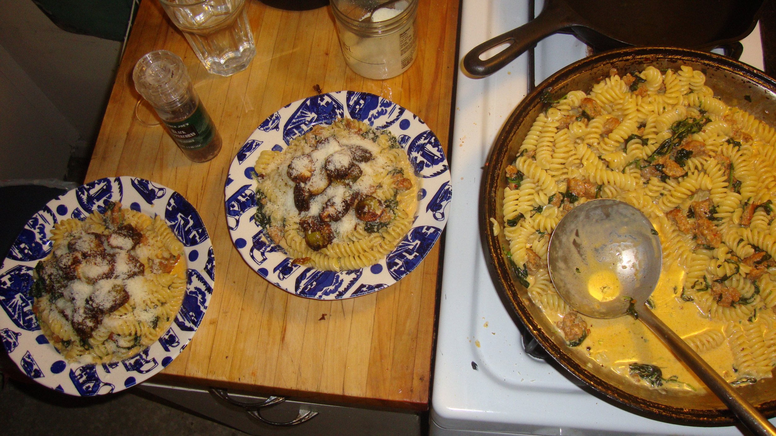 While your pasta cooks, drop the heat on your sausage and spinach to just under medium and add your cream, making sure to scrape the bottom of the pan to get all that wonderful sausage fond off the bottom. Let this simmer and bubble, stirring occasionally, until your sauce reduces and your pasta is fully cooked.